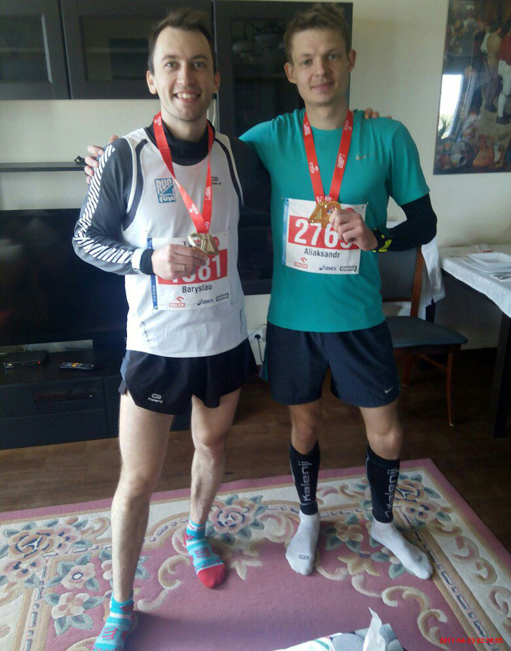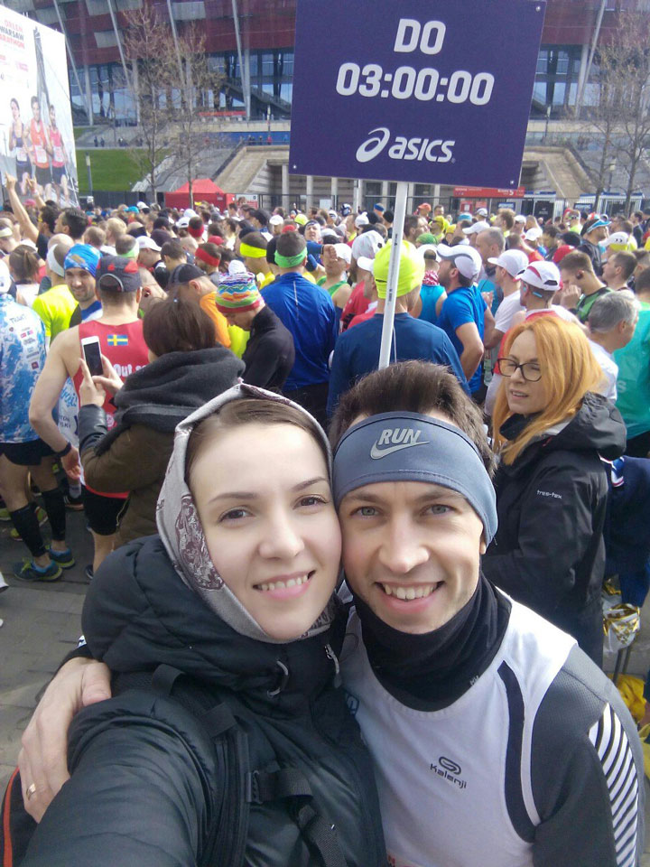 За неделю, как водится, я решил провести марафонскую диету. Поэтому с понедельника по среду я отказался от углеводов. На вечер среды у меня была намечена выжигающая тренировка. После легкой разминки я пробежал 3 км в марафонском темпе, а после сделал 5 ускорений по 200 м быстро. Результаты пробега были удручающие, средний пульс темпа был около 165, что было на 5 уд/мин быстрее желаемого. Поэтому темп бега 4 мин/км на марафоне становился под вопросом. Последние дни до марафона старался больше отдыхать и по возможности высыпаться. В субботу утром в 6:30 мы выехали из Гродно впятером. Ехали я с женой, Александр Шило и наши друзья Наталия и Виталий. Порядочно «прогнив» в очереди на границе, в Варшаву мы приехали только к 15:00. Забрали стартовые пакеты и заселились в апартаменты рядом с местом старта. После этого мы с Сашей отправились на пробежку и на Pasta Party. Вернувшись в апартаменты и немного отдохнув, мы всей компанией пошли прогуляться по городу, а за одно и в очередной раз покушать пасты. Вечером я постарался лечь спать пораньше, ведь завтра старт был намечен на 9 утра.