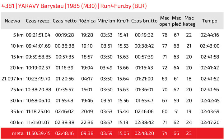 Всего лишь 2 км осталось до финиша. Сжав волю в кулак, превозмогая боль, я постарался бежать. Бежать изо всех сил. И вот он долгожданный поворот на финишную прямую. А значит совсем скоро финиш. Выкладываюсь по полной, несмотря на сильнейшую боль, спринтую. Главное не останавливаться. Вперед. Пересекаю 2 резиновых коврика. Уже можно останавливаться??? Да! Есть результат 2:48:20! Я сделал это. Ура!