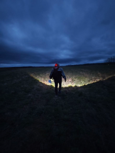 Взяв КП и просматривая путь к следующему, увидали по карте какую-то заброшенную лесную дорогу. Решение принято. Едем. Что может быть лучше чем поехать по глухой лесной дороге в незнакомом лесу ночью? Конечно – заехать в чащу леса, где дорога окончится. Посмотрев навигатор, было решено идти напрямую. С велосипедами. По бурелому. Вышли к канаве за которой через поле наше КП. Перебрались через канаву и заросли ежевики. Вроде все ок. Но нет. Все поле заросло какой-то растительностью под два метра. И расстояние до КП меньше километра. Что нам это после бурелома? Снова вперед. На поле встретили другую команду, которая по своей воле либо на наши огни, поползла за нами по лесу и этому полю. Не знакомились с ними, но осознавать, что в таком месте мы были не одни – приятно.