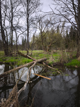 Первый КП был недалеко. Походив радом с точкой и не найдя его, попросили помощи у местных жителей. Мужчина, удивившись что КП стоит в соседском огороде, провел нас к нему. Отметившись, пошли ко второму КП. Раздвоенная сосна. На месте вырубки. Проходив по лиственному хмызняку минут тридцать, решили пересмотреть карту и уточнить точку относительно другого КП. В итоге, сместившись метров на пятьсот, увидели. Раздвоенные сосны. Сразу три. В болоте. Необходимая нам сосна была вторая. Отметившись на втором КП, проложили маршрут к третьему. Разрушенная дамба в восьми километрах.
