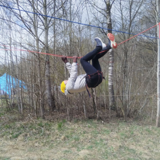 Коллега Ирина выбрала веревочный этап, так как бегать на квесте не было желания. Поднявшись на растянутые веревки, решила что дополнительные баллы не стоят потраченных сил, спрыгнула вниз, и мы благополучно пошли делать окончательные отметки финиша.