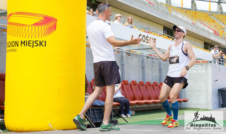 Прибегает первый поляк, вторым же — наш Дима, ура! Теперь дело за Чемодановым. Финишировать ему придётся в небольшом отдалении от старта, по красной дорожке. Поэтому мы перемещаемся туда. Время близится к 30 минутам, а значит, пора и мне встречать Алексея. Бегу к отметке 3 км. Впереди едет машина с табло, а за ней первый финишёр — украинский легионер в белостокской команде. Кто же будет вторым? И вот он, силуэт Алексея! Ура! Бегу рядом и поддерживаю как могу. На финише поздравляю Чемоданова, ура! Мы — вторые!